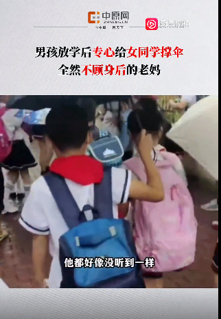 9月15日,浙江台州。一男孩放学后专心给女同学撑伞,一路全然不顾老妈在身后呼叫。母亲张女士称,最近有台风,学校就通知提前去接孩子放学,当时在校门口看到他出来,就招手叫他。