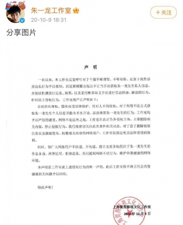 虽然朱一龙从未公开承认自己有女朋友,而且很低调,也没有绯闻,但网友们不禁猜测他已经隐婚生子,结婚对象就是他大学同学。在"隐婚生子"舆论发酵越来越快的时候,朱一龙工作室亲自出面发表声明,希望广大网友不要散布谣言,不信谣,也直接否认了这个消息。