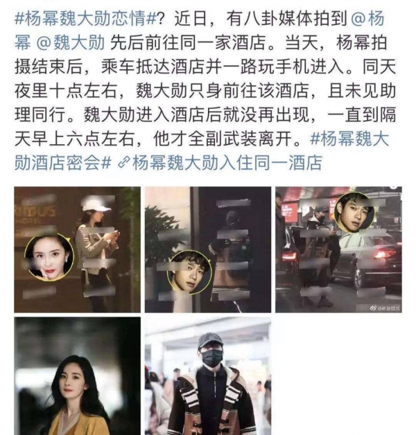 前段时间,媒体还拍到魏大勋和杨幂先后去同一家酒店。网友猜测两人是恋情,但杨幂和魏大勋均未出面回应绯闻。这段时间,魏大勋和杨幂再也没有互动,而在与杨幂的绯闻之后,魏大勋也没有任何新动向。