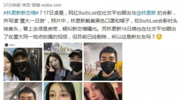除了作品之外,他的感情生活也一直备受大家关注。前段时间,一位名叫SurbLue的网红在社交平台晒出了与林更新的合影。疑似林更新新女友曝光,引发网友热议。林更新没有回应。