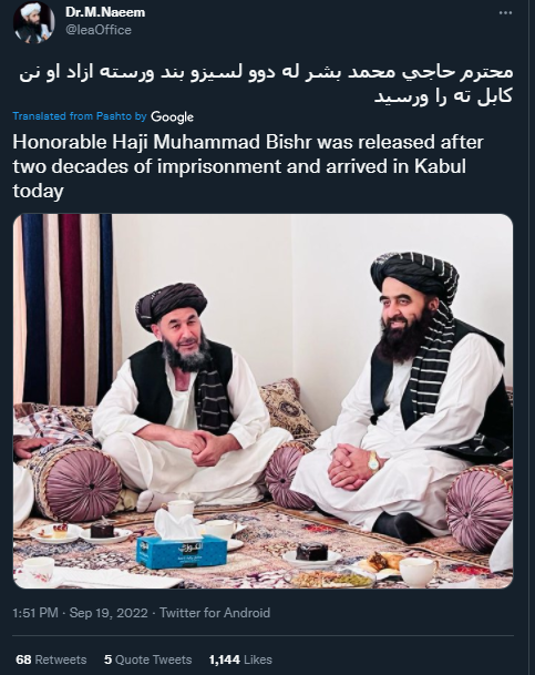 阿富汗塔利班政治办公室发言人纳伊姆同日在推特上发文称,"尊敬的巴希尔·努尔扎伊在经历了20年的监禁后,于今日被释放,并抵达喀布尔。"