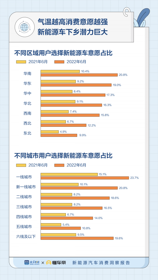 不同区域和城市的消费者对新能源车的选择倾向各有不同。从地域来看,越靠南部区域,消费者对新能源车的购买倾向越高,华南消费者的购买意愿度是东北消费者的2倍多。分析指出,东北、西北等区域消费者对新能源车的接受度较低,和气候寒冷、基础设施不足等客观因素关系较大。
