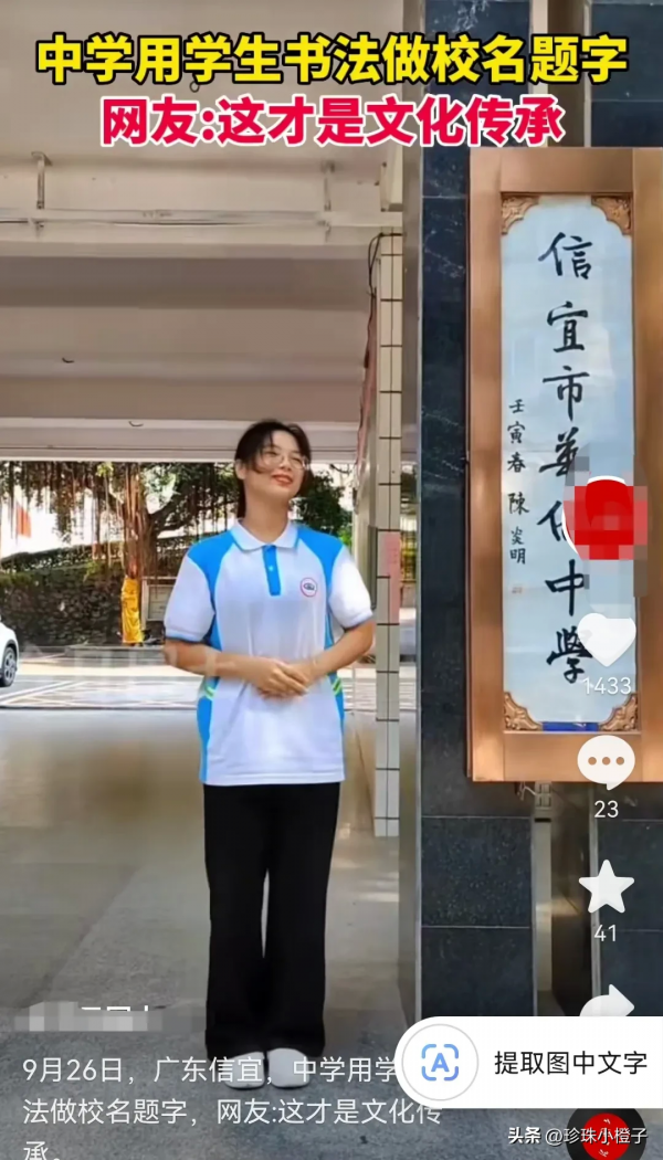 9月26日,广东信宜,一所中学用学生的书法做校名题字。学生的作品轮换着展示,能够为学校题字展示的学生一定很自豪吧!