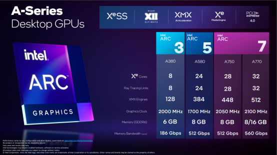 在台式机版本的Arc 7显卡中,英特尔又规划了Arc A770和Arc A750。