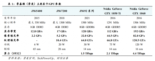 财信证券研报指出,景嘉微2018年发布的JM-7200系列,纸面性能与英伟达2011年的低端显卡差不多;到2021年12月发布的JM-92系列,性能已赶上英伟达2016年的中端显卡。