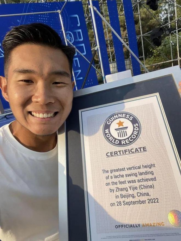 2022年9月28日,经吉尼斯世界纪录认证,来自北京的跑酷达人张艺杰以40.6厘米的成绩创造了【悠杆双脚落地高度最高】的吉尼斯世界纪录称号。