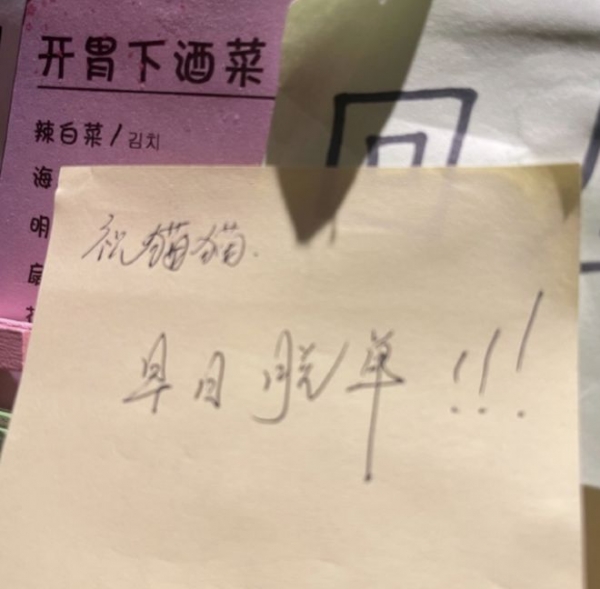 看看周扬青晒的图五便利贴,有个人写下了"祝猫猫(周扬青的助理叫猫猫)早日脱单!!!"的留言。