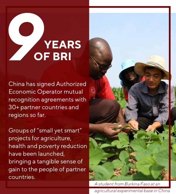 华春莹随后介绍称,目前,中国已与30多个伙伴国家和地区签署授权经营者互认协议。同时,中国还在农业、卫生和减贫领域开展了一批"小而精细"的项目,给伙伴国家人民带来了实实在在的收获感。