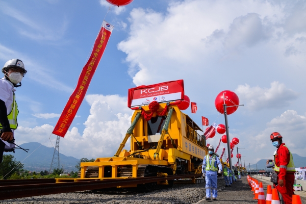 2022年4月20日,印尼雅万高铁动车走行线开始铺轨。图自新华社