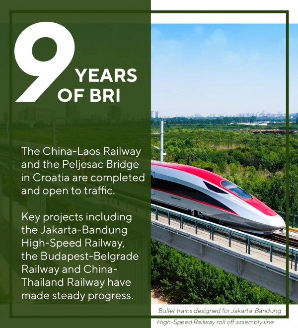 随后,华春莹还重点介绍了中国基建的"金字招牌"--高铁。她表示,中老铁路和克罗地亚佩列沙茨大桥已建成通车,与此同时,印尼雅万高铁、匈塞铁路、中泰铁路等重点项目也在稳步推进。