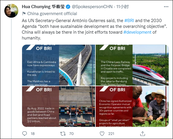 "正如联合国秘书长安东尼奥·古特雷斯所说,'一带一路'倡议和2030年议程都以可持续发展为首要目标。中国将永远在人类发展中共同努力。"华春莹不仅这样写道,还通过一组照片和事例,向世界充分展示了中国近年来为国际社会所作出的贡献。