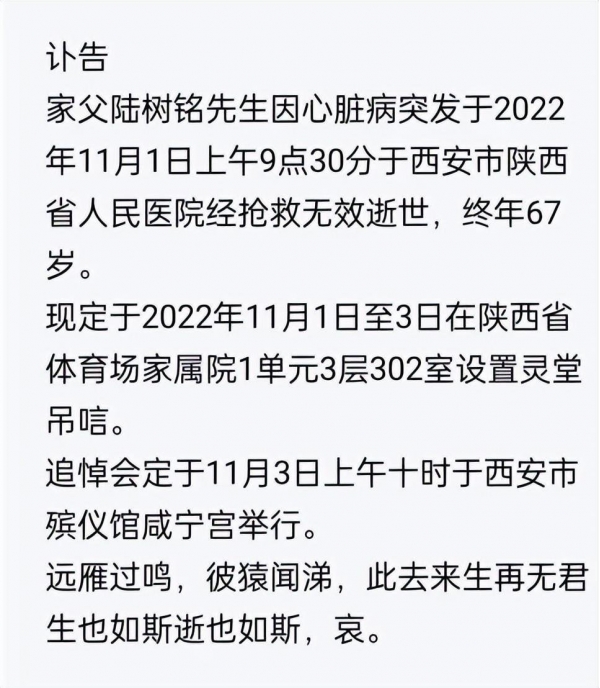 从其导演儿子陆维伦的讣告(闻)中得悉,陆树铭老师的追悼会及告别仪式在11月3日上午10点于西安市殡仪馆举行,各界人士纷纷前来吊唁。尽管前一天,陆家班大弟子郭少杰曾在社交网呼吁"因特殊时期,避免人群聚集,远在的弟子、亲友、影迷,无需来西安悼念"!
