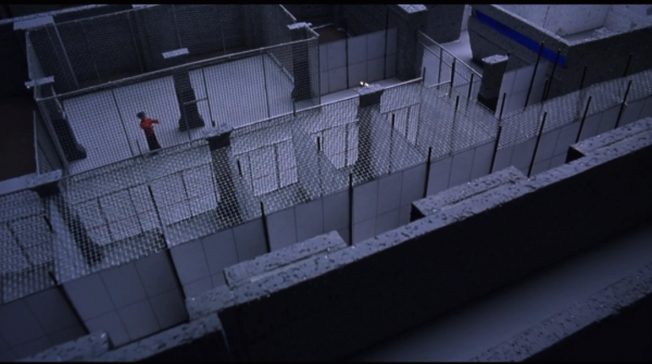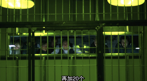 在真实实验中,双方人数是均等的,但这部片把囚犯的人数增多了,变成了一对多的比例,而且故意在布景上强调看守房有一扇可以从高处看到所有监狱房间的窗户,这种空间设置,导致只需要一个看守就可以看住所有囚犯的房间。