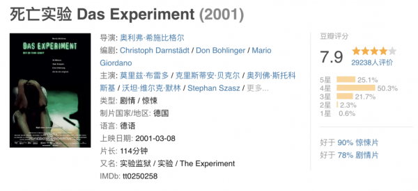 除了教授本人的书和一些小说,这个实验还被拍成了四部电影(一部纪录片,三部剧情片)。我们今天主要选2001年德国拍摄的这一版去聊。