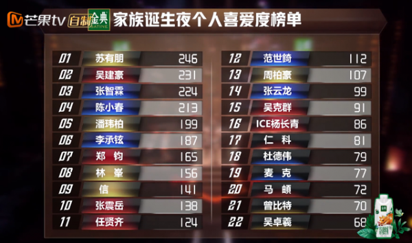 任贤齐排名11,这和五公保持一致,也是本季个人最低的排名,当然从四公开始喜爱度开始下滑,一直到总决赛并没有反弹,令人遗憾。