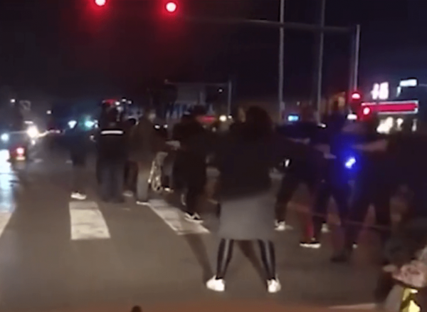 视频中显示,右转车道已经完全被大妈们侵占,过路车辆纷纷避让。