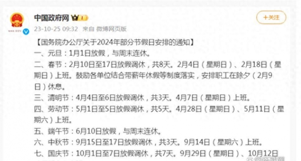 2024年放假安排:除夕不放假,企业安排年假连休。2023年10月25日,国务院终于发布了2024年的放假安排。这次的安排引起了不小的惊讶和讨论。与往年相比,明年的春节假期有了一些不同之处。