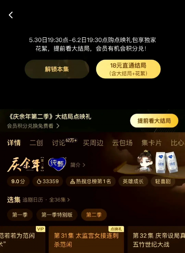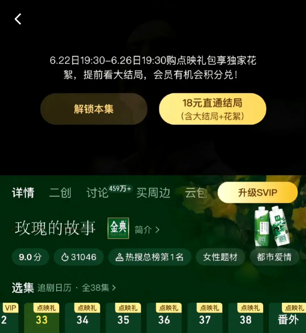 从播放平台的显示来看,其开放超前点映的集数为4集正剧加一个番外总共收费24元,而同日开放点映的《玫瑰的故事》则为18元,而前不久刚播完的大热剧《庆余年2》也为18元。
