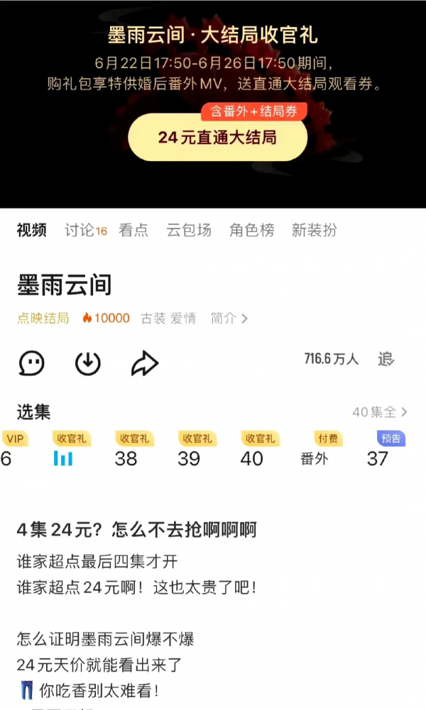 不过剧火了肯定也是难免会有一些不太好的声音出现。就在6月22日,《墨雨云间》收官之际,就出现了一个不大不小的插曲。那就是关于超前点映收费标准被观众吐槽过贵。
