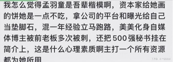 董明珠给的画饼要将她培养成自己的接班人,年会需要节目让她上就得上,直播需要流量就拉着她共同出镜,忙活一圈到头来却只给她开出普通员工的工资,好在孟羽童一直都十分清醒,在看清资本家的真面目后,借着格力的平台和曝光为自己铺路,积攒到足够的经验后直接跑路,做自媒体博主短短一年半就营收400万,甚至还将世界500强公司秘书的经历挂在简介上,主打一个所有资源都可以为她所用。