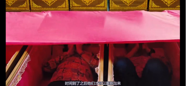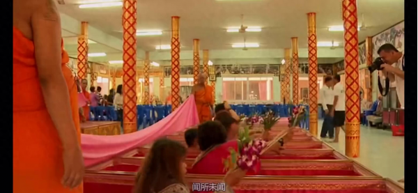 首先他们在举行婚礼之前,新娘子要先去到寺庙,在里面的棺材里躺一躺。可以看到来参加的人还真不少,他们一起进入这一排排棺材中,会有僧人盖上特制的布,时间到了之后他们才可以重新出来。泰国人们认为这样做可以破除厄运,给人们的生活带来好运。