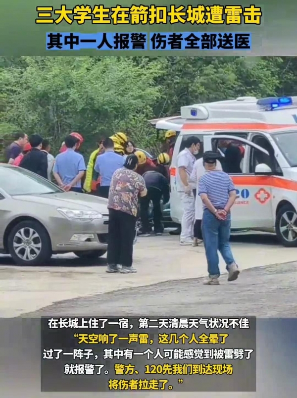 这三名大学生是前一天夜爬未开放的箭扣野长城,然后露营夜宿,第二天清晨醒来被雷电击中,其中一个人慢慢苏醒意识到遭雷击就报了警。