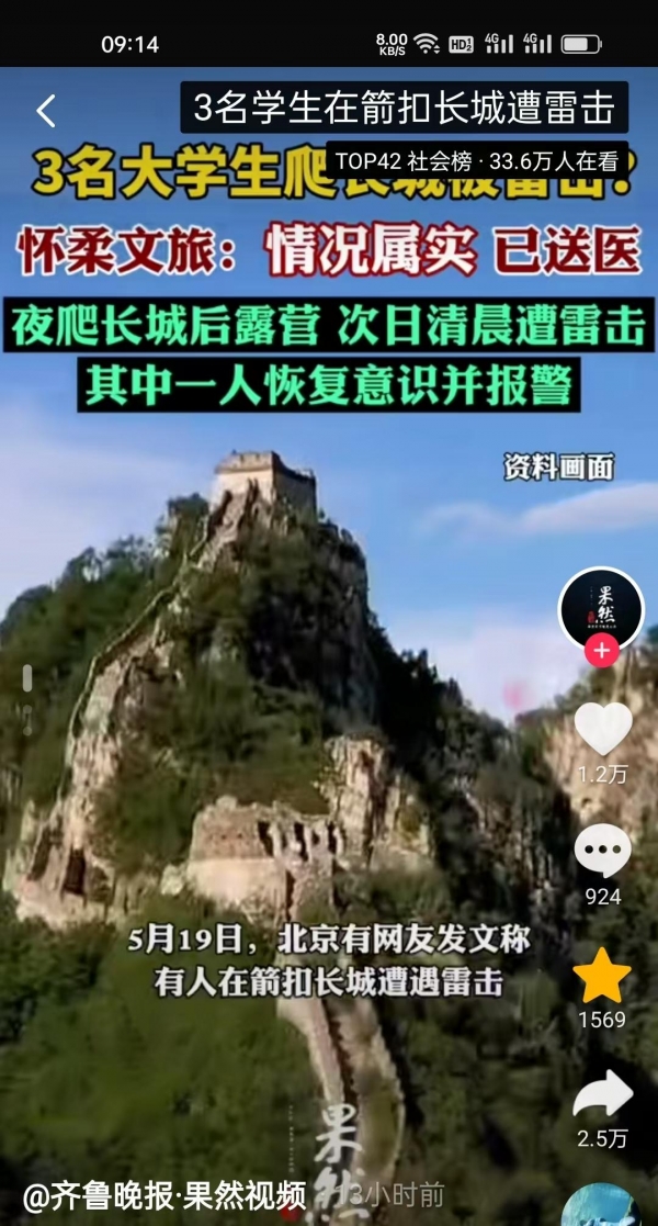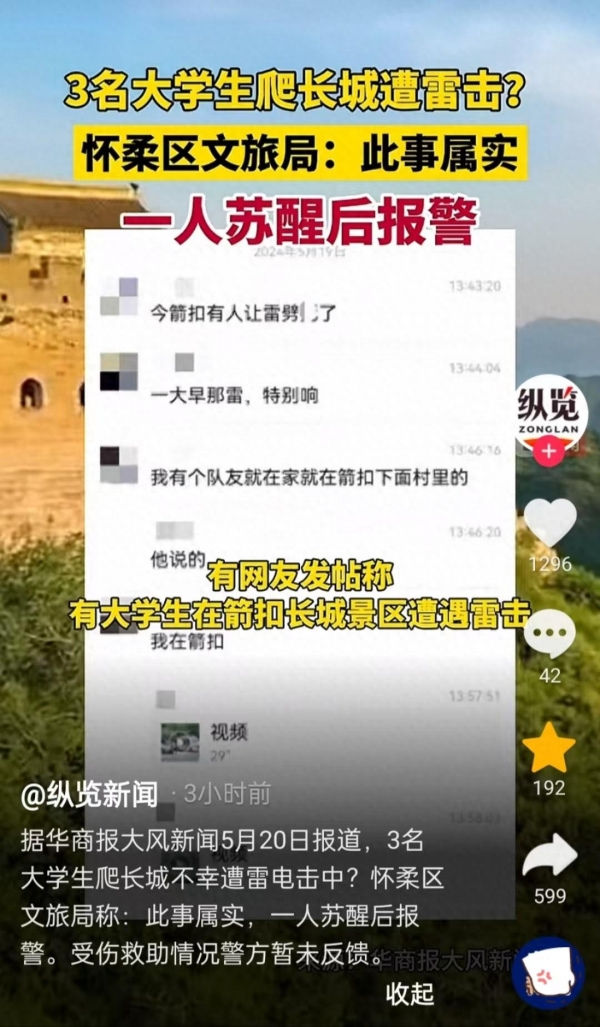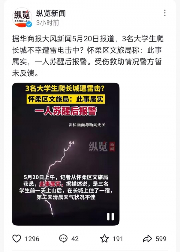 5月19日,在社交媒体上,有网友爆料,在箭扣长城上,有3名大学生遭遇了雷击,此事经媒体转发之后,获得了很多人的关注和热议,大家都想知道这件事是不是真的?