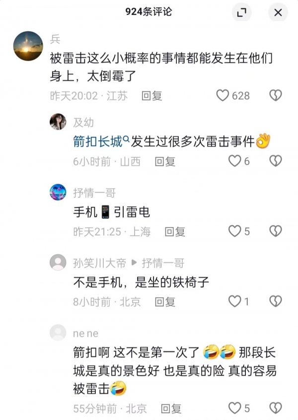 其次,有熟悉箭扣长城的网友也表示,箭扣长城发生过很多次雷击事件,虽然那段长城的景色好,很险要,但是很容易被雷击。