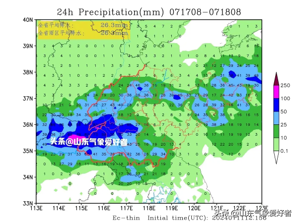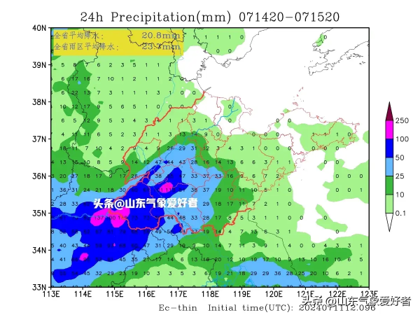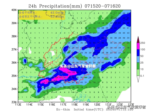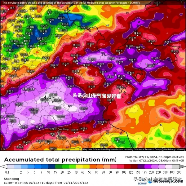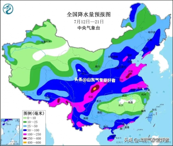根据中央气象台最新发布全国中期降水量预报图,山东全省地区的中期降水强度都被再次调强,并将成为北方降水的中心区域。CMA(中央气象台)预测我省大部地区未来十天累计降水量将达到100毫米以上,鲁西南部分地区可达到250毫米以上。下图可见,未来10天(7月12日-21日),青藏高原东南部、四川盆地、云南西部和南部、西北地区东南部、黄淮、江淮以及华北中南部、东北地区南部等地累计降水量有60~120毫米,其中四川盆地、黄淮、江淮等地的部分地区有150~200毫米。