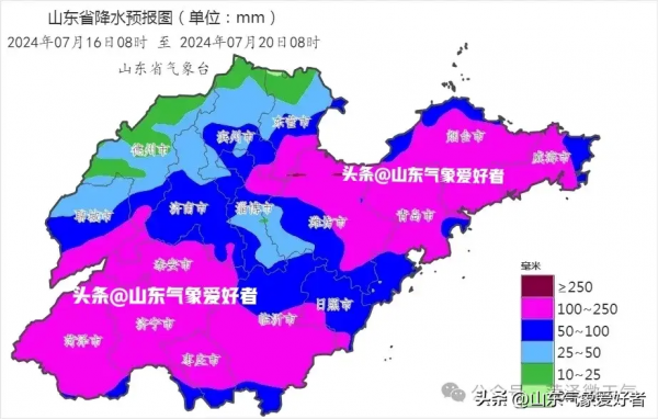 16~20日我省还将出现新一轮降雨天气过程,根据山东省气象台发布的最新预报,鲁南、鲁中西部和半岛地区将出现大范围的大暴雨天气。其中,菏泽、济宁、枣庄、临沂、泰安、济南南部、潍坊东部和北部、青岛、烟台、威海、东营南部、聊城南部等地累计降水量将达到100毫米以上,局部地区250毫米以上。此外,我省其他地区也将出现中到大雨或暴雨,降水最少的鲁西北北部地区也将有10~30毫米的降雨。