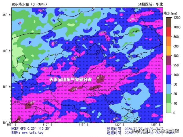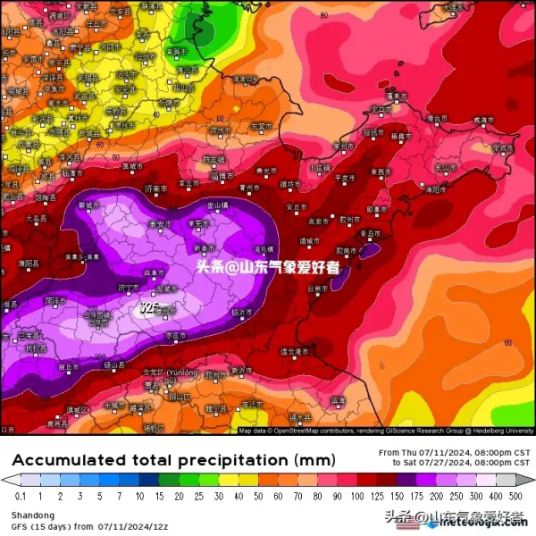 另外一个权威数值预报GFS模式,也是同样预测我省的降雨中心会出现一定的变化。根据最新的预报资料,未来十五天山东降水中心分布在鲁中和鲁南地区附近,聊城、泰安、淄博南部、济南南部、临沂、枣庄、济宁、菏泽等地累计降水量在150~250毫米之间,济宁东部、枣庄北部等地局部可达到300毫米以上。此外,鲁西北东部地区降水量在60~80毫米之间,其他地区去普遍80~150毫米。