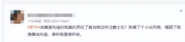 到底是黄宣水平太高还是我没有艺术细胞,真的欣赏不来,客观的觉得很刺耳,别唱砸了就挽尊说先锋,难听就是难听,这么松弛的表演被骂成这样真无语,只能说内娱观众的音乐品位还有很长的路要走,看到黄宣被骂确实证明了,审美是主观的,审美高低也是客观存在的