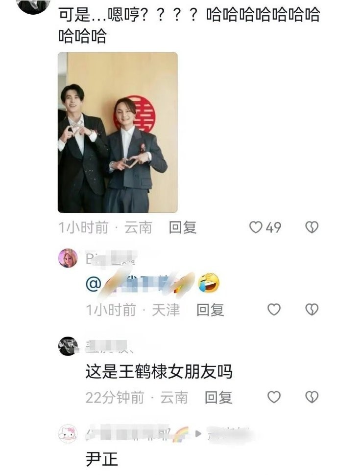 近日,有网友分享了王鹤棣和尹正同框照,评论区有些网友调侃尹正看起来像是王鹤棣的女朋友,觉得王鹤棣和谁都很有cp感。