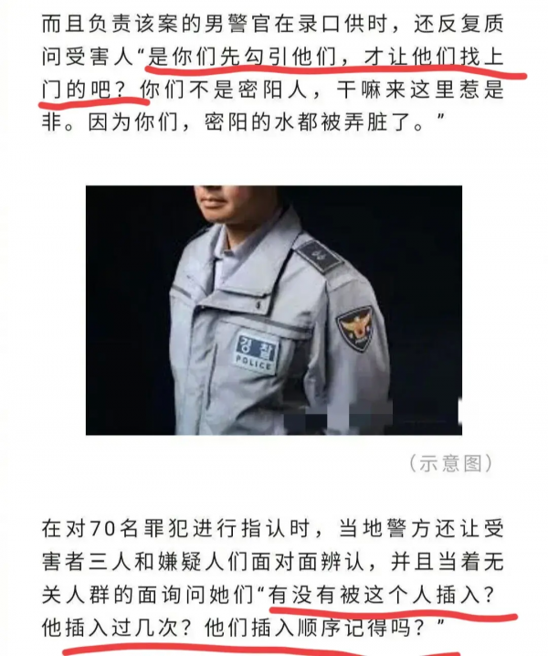 在调查过程中,当地警方的做法也让人无法苟同。受害者有罪,用极具侮辱的问询方式,让其当着嫌疑人的面回忆被轮奸的顺序和次数。