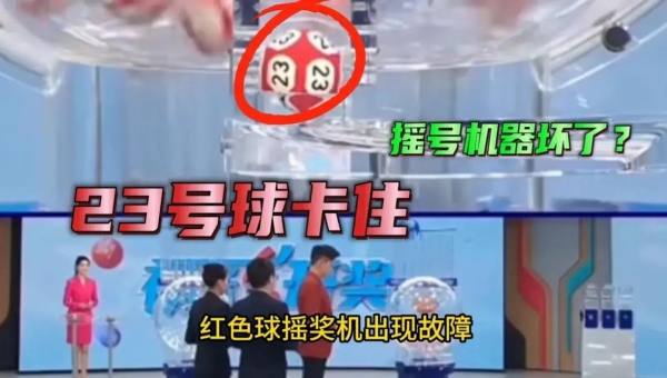 在轻微反弹后,23号球最终落了下去,当第二个红球开到20号球时,摇奖机出现了故障,20号球迟迟未落下,一直卡在出球口处。