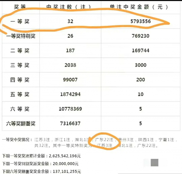 一等奖开出了32注,广东开出22注,而且是出自一位彩民之手,单注奖金570多万,一共22注,算上特别奖也就是1.44亿元。