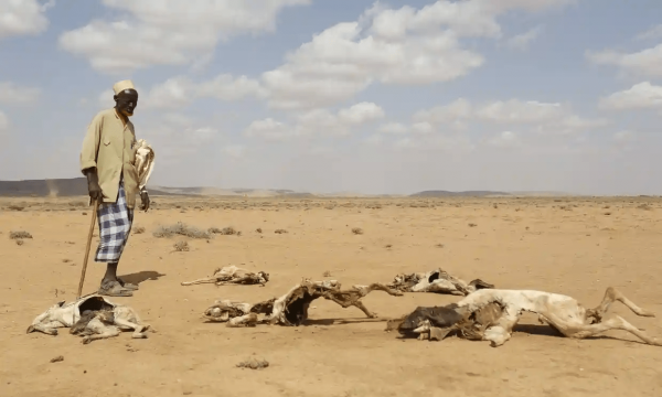 2016年4月,索马里,一名男子看着因厄尔尼诺引发干旱而死的动物尸体