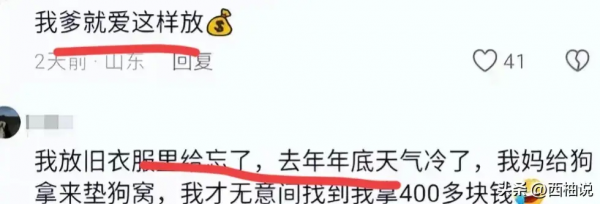 也有很多网友称"我爹也爱这样放钱","我放旧衣服里忘了,去年年底天冷了,我妈拿来给狗垫窝,我才无意间找到我拿的400块钱。"。