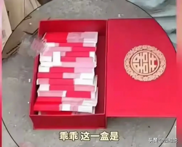 盒子是大红色,上面还有一个黄色的喜字,估计是订婚或者结婚的礼金。