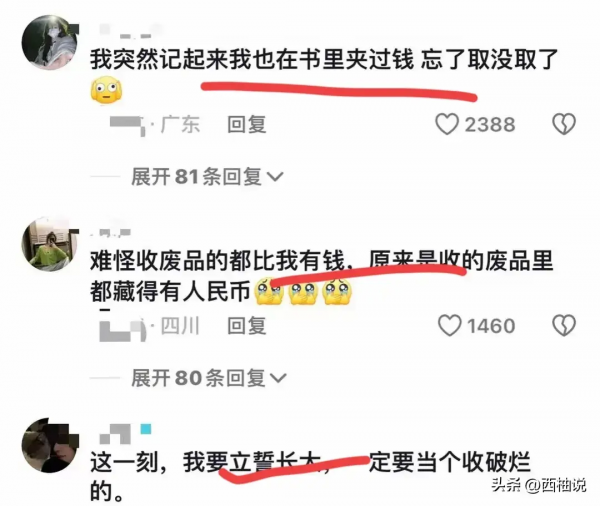 还有很多网友表示,难怪收废品的都比我有钱,原来是收的废品里都藏有人民币。"这一刻我发誓,将来一定要当一个收破烂的。"。