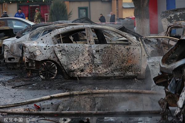 当地时间2023年12月30日,俄罗斯别尔哥罗德,炮击后受损的汽车。(图源:视觉中国)