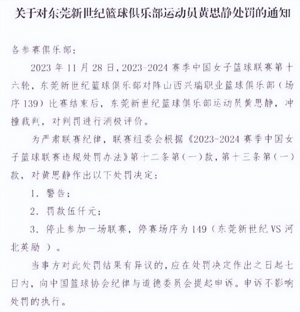 本来当时黄思静就憋着一股气,看到这一幕就更加生气了,她直接找到裁判理论要求更正判罚。然而就因为情绪比较激动有些失控,黄思静的理论行为却被联盟判定为顶撞裁判,在比赛结束之后直接开出罚单,罚款5000元还停赛一场,要求黄思静好好反思一下。