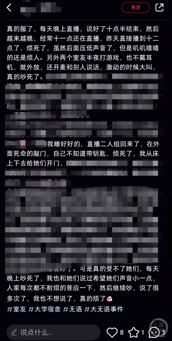 在某社交平台搜索"室友在宿舍直播",上游新闻记者发现超过50篇笔记都是有关大学生寝室直播引发室友不满:"每天晚上吵死了,我也和她们说过希望她们声音小一点,人家每次都不耐烦地答应一下,然后继续吵""我觉得在寝室直播就是不合适啊,但是想不到什么严肃有效的理由让她不直播,求大家帮忙出谋划策一下"……