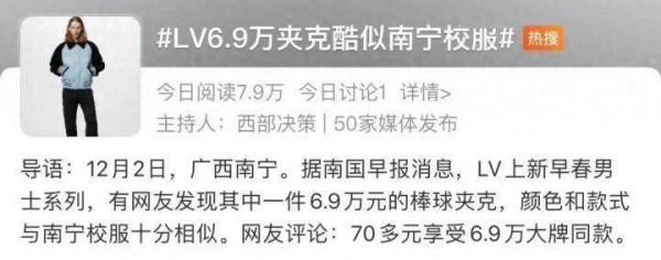 近日,有网友在浏览LV官网时偶然发现,其中有一款价值6.9万元的棒球夹克,其颜色和款式与南宁学生的校服十分相似。