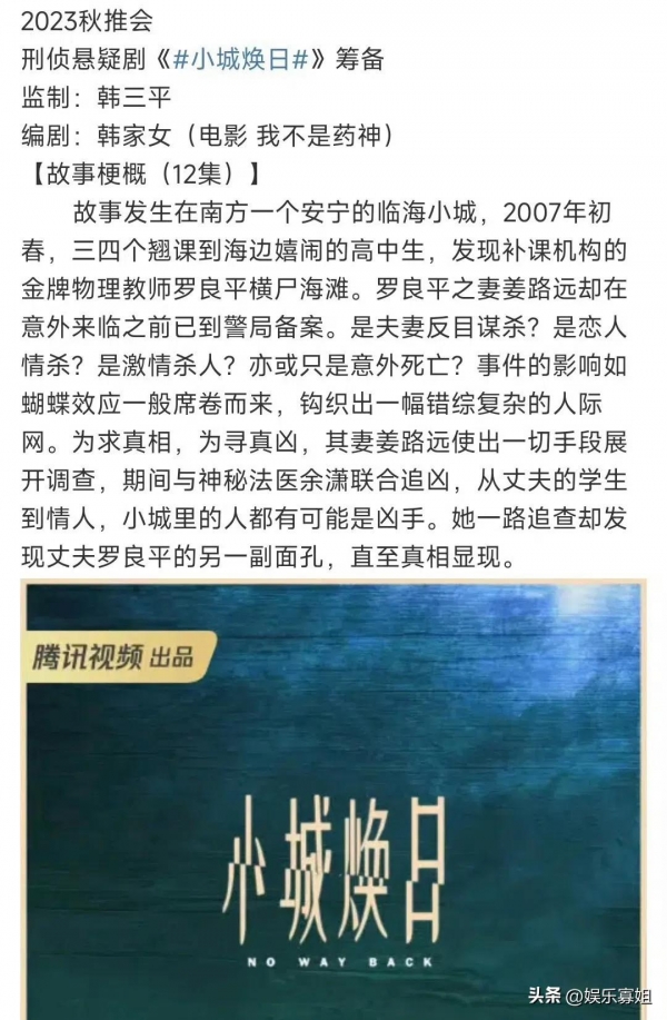 网传辛爽导演新剧《小城焕日》即将开拍,大女主现实题材刑侦悬疑剧,演员阵容强大,刘亦菲、秦昊、林更新、朱珠、文淇等主演,编剧是韩家女(作品《我不是药神》),这配置真的太期待了!