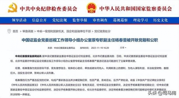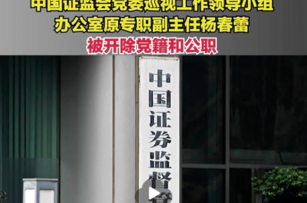中央纪委国家监委、中国证监会党委、北京市监委经过充分研究,决定给予杨春蕾开除党籍和公职的处分,并将其涉嫌受贿犯罪问题移送检察机关审查起诉。