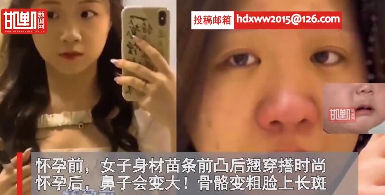 换孕前,女子身材苗条,前凸后翘穿搭时尚,怀孕后,鼻子会变大!骨骼变粗,脸上长斑。