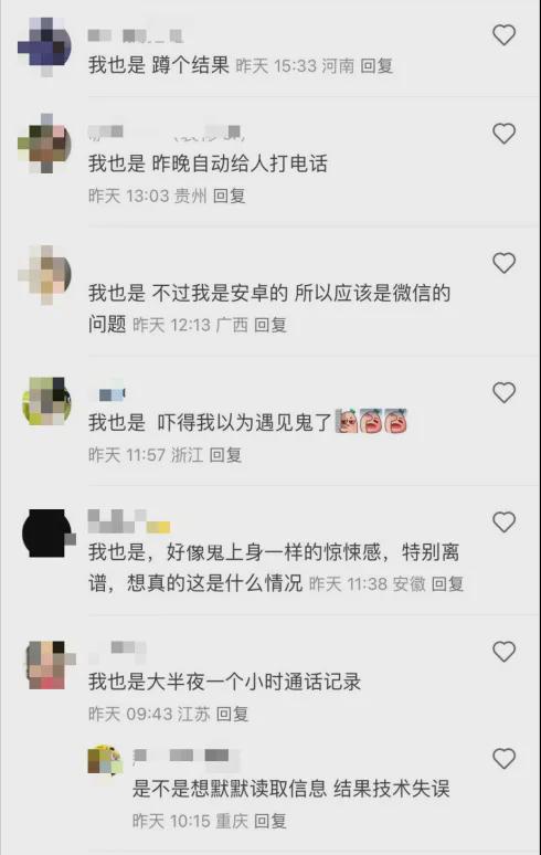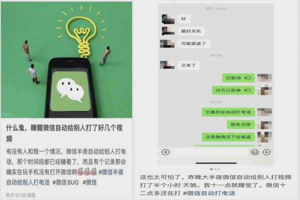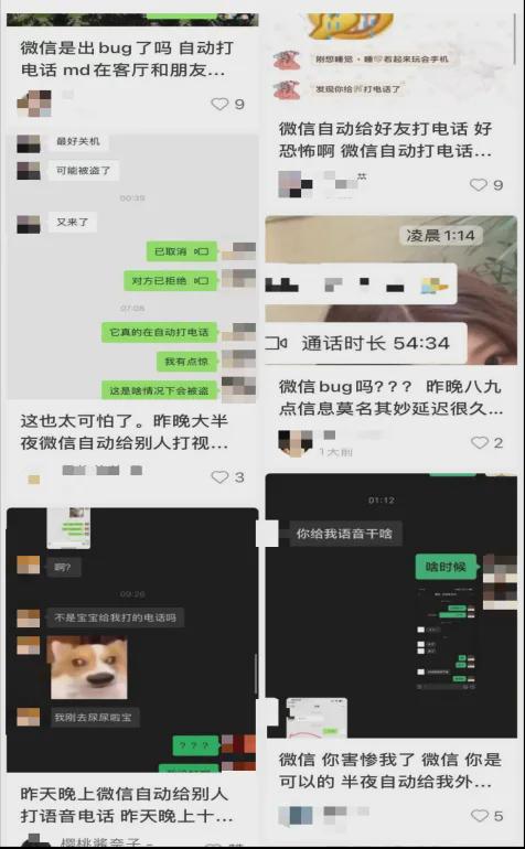 网友"西红柿"反映,睡醒后,微信自动给别人打了好几个视频,那个时间段都已经睡着了,而且那会确实在玩手机,但是没有打开微信。网友"是悠悠的呀"反映,昨晚大半夜微信自动给别人打视频打了半个多小时,我十一点就睡觉了,微信十二点多还在打。