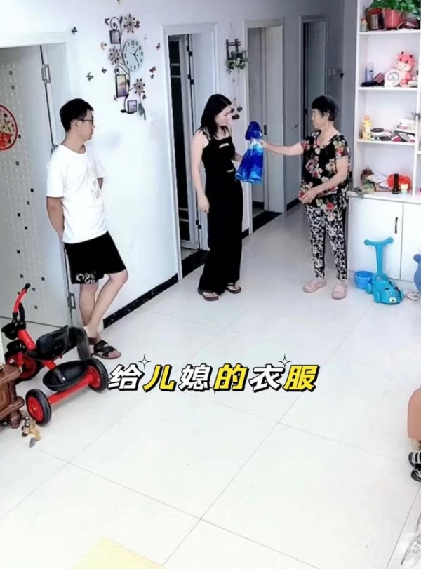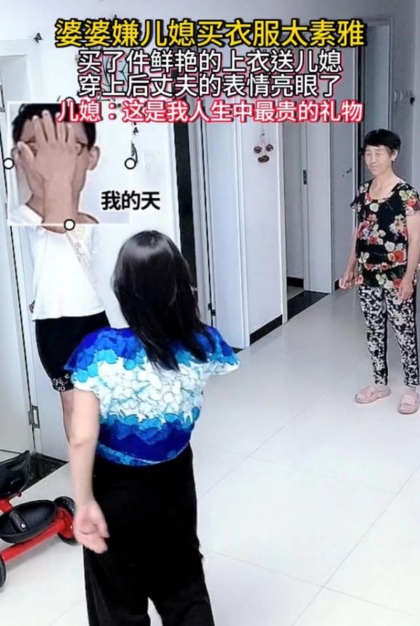 6月27日消息,婆婆嫌儿媳穿衣服太素雅,买了件鲜艳的上衣送儿媳,女子穿上后,老公的表情亮了。