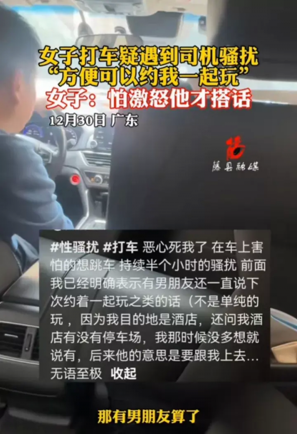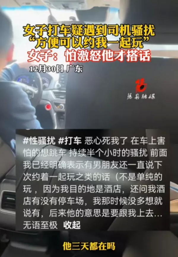 2023年12月30日,一女子要去酒店,于是她就打了一辆车。然而,在女子乘坐的过程中,司机便对她进行了骚扰,女子说足足有半个小时的时间。